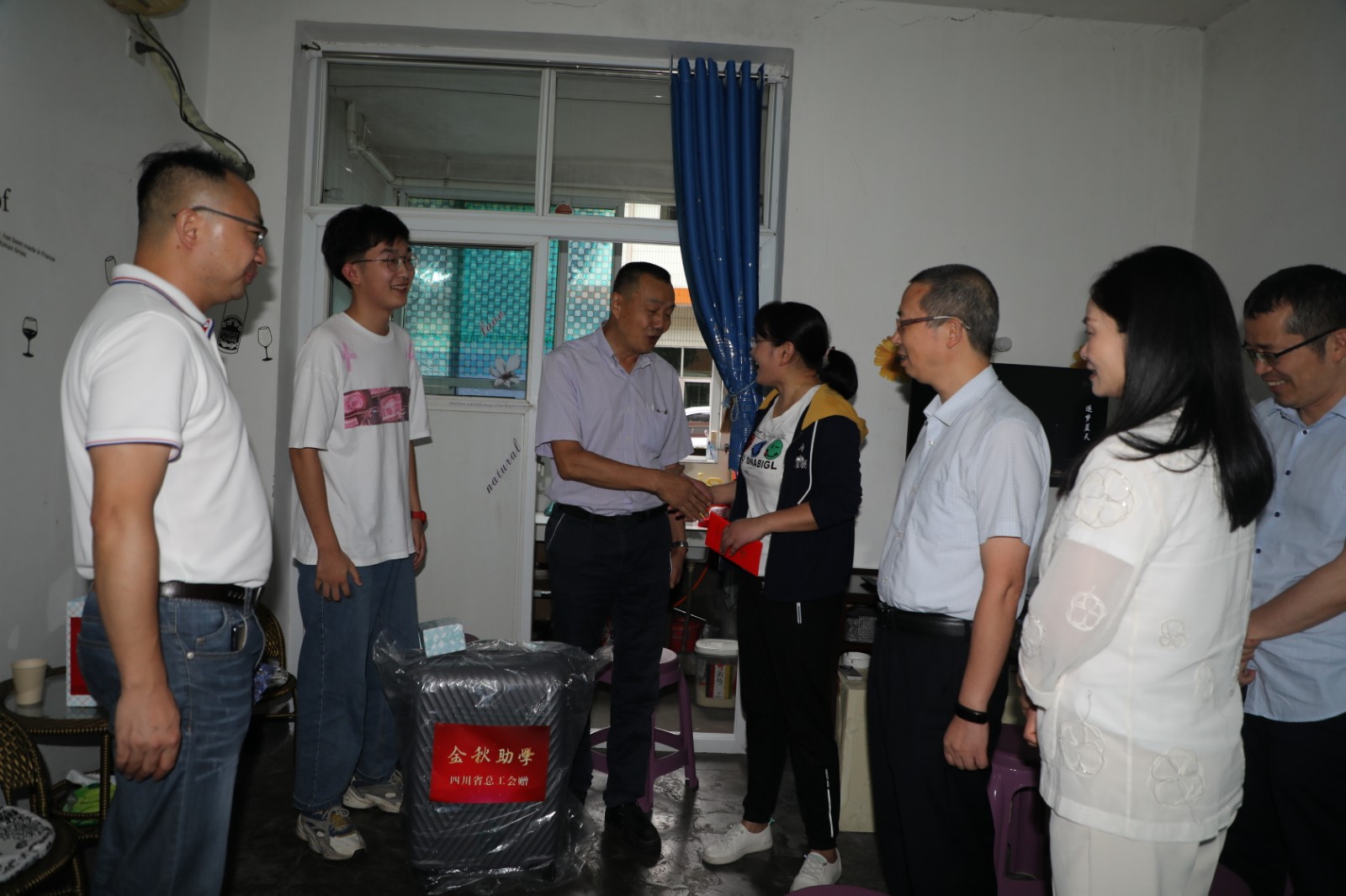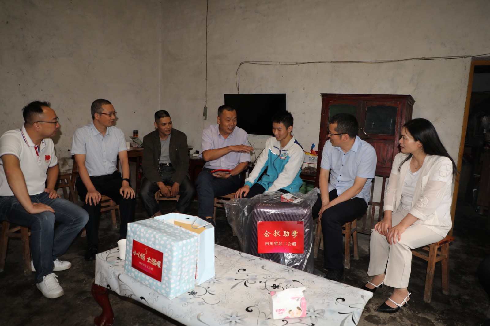8月26日,四川省总工会二级巡视员陈黎一行冒着细雨来到嘉阳困难职工家庭,看望慰问即将入学的贫困大学生,为他们送去组织的关心和问候。