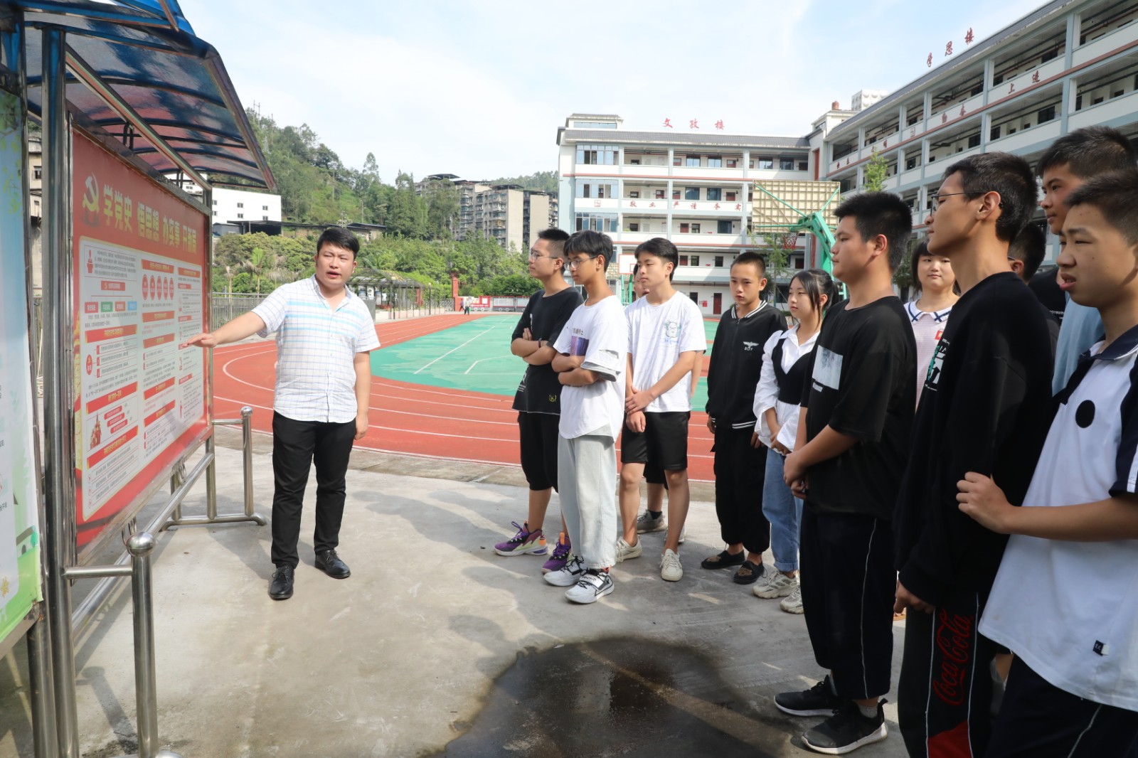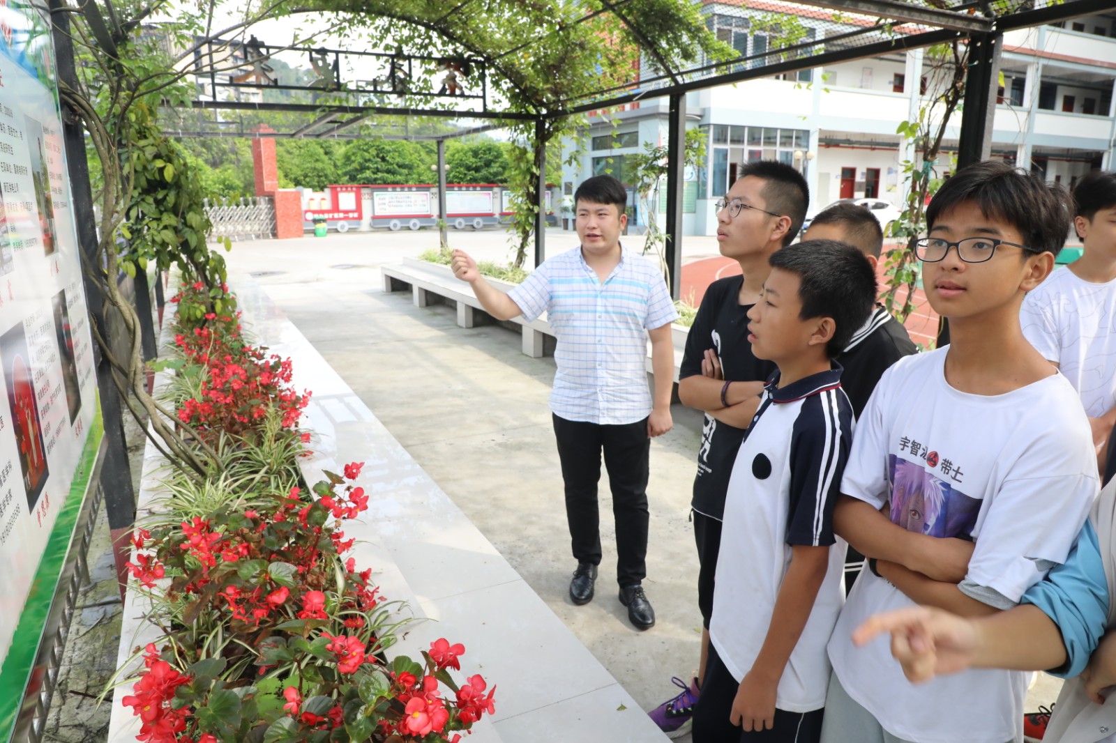 文化长廊由集团公司负责施工建设,主体结构采用轨道钢搭建全长50米,廊下两排坐椅方便学生休憩、晨读,长廊四周以串串红、紫藤等花草点缀,取名“畅亭”,立足自身实际,文化长廊设计有“党史学习”“红色小故事”“学校发展史”“校友风采”等多个版块,图文并茂、生动形象,让党史知识、校园文化鲜活地呈现在师生们面前。不仅有利于校园文化氛围的营造,还有利于了解党的历史和发展历程,传承伟大的建党精神。切实提升学生思想政治教育的针对性和实效性,有效激发了党史学习教育的热情。