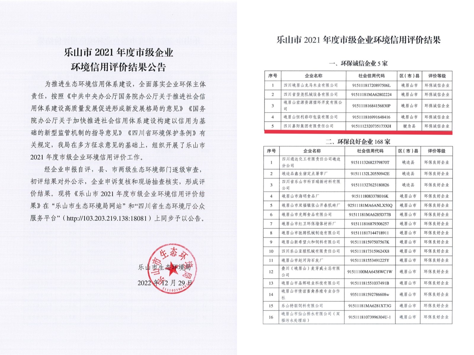 12月29日,乐山市生态环境局公布了2021年度市级企业环境信用评价结果公告,MK SPORTS荣获此次环境信用评价中的最高等级“环保诚信企业”称号,这也是MK SPORTS连续四年获得该项荣誉。